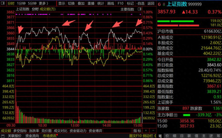 从大盘的分时走势来看,低开走高后起伏不定,几乎全天都在O轴上方运行,但市场量能较前一个交易日30013亿缩量,全市成交28306亿。截止收盘,三大指数集体收涨:上证涨0.33%,报收3857.93点;深证成指涨0.99%,报收12696.15点;创业板指涨2.33%,报收2890.13点。