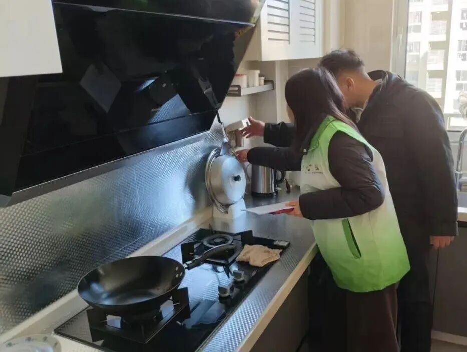 物业上门检查电线插座、燃气阀门,排查火灾隐患。图源:上观新闻