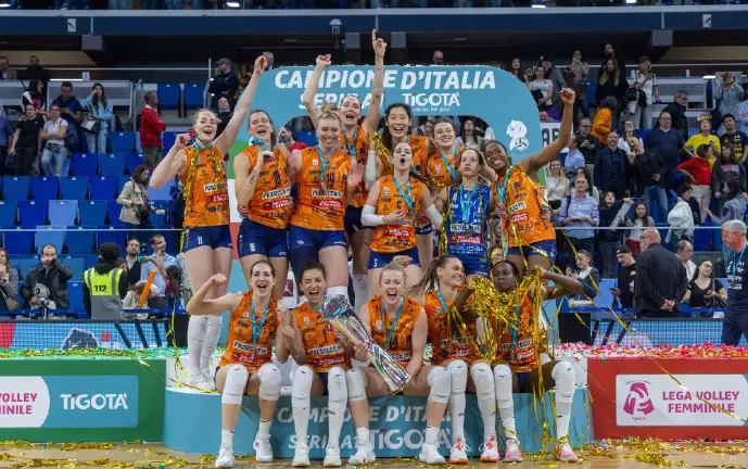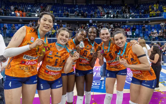 这也是,31岁的中国女排传奇球星朱婷,拿到的第2个意甲女排联赛冠军,加盟科内利亚诺队后,朱婷2个赛季已经拿到了6座沉甸甸的冠军奖杯。整个职业生涯,朱婷已经拿到了26座冠军奖杯。